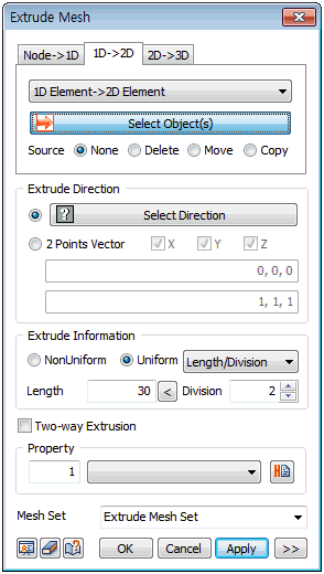 Select the 1D element, element side or edge to be extruded and set the extrude direction, length and number of divisions. The element can be created by extruding in 1 direction or 2 directions. The original element used in extrude can be deleted/moved/copied. For move, the used element is moved to the end of the extruded element.