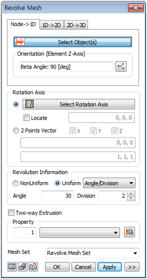 Set the rotation angle and division of 1D element will be created. The division spacing can be set as either uniform or non-uniform. Entering a positive angle rotate extrudes in the counterclockwise direction and entering a negative angle rotate extrudes in the clockwise direction.