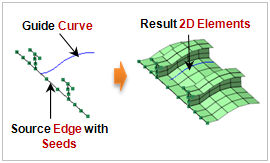 Select the 1D element, element side or seeded line (edge) to be extruded and directly select the sweep guide curve or node positions that can substitute the guide curve. The element size can be directly entered or defined by the number of divisions on the selected extrude curve. The original element used in extrude can be deleted/moved/copied. For move, the used element is moved to the end of the extruded element.