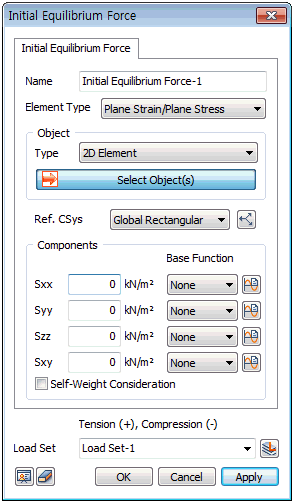 The load application direction for the initial stress of Plane/Axis symmetric/Solid elements can be set with reference to the GCS or element coordinate system.