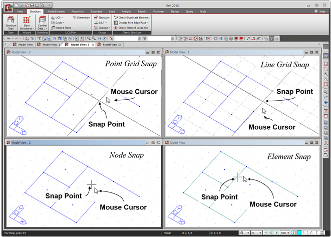 When creating nodes or elements or assigning attributes with the mouse cursor and if the mouse is moved to the vicinity of a desired grid, node or element, Snap allows the mouse cursor to automatically snap to the relevant position. |