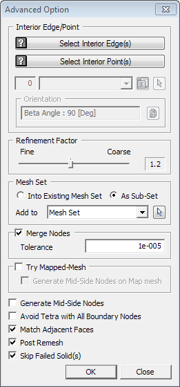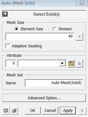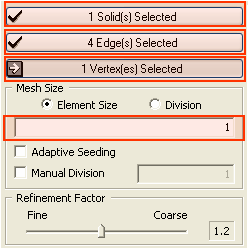 1. Select solid(s) to generate Mesh. 2. Select Interior edge(s) to be included in the mesh. 3. Select Interior vertex(s) to be included in the mesh. 4. Make sure sizing method is in Element Size (Refer to Size Control>On Shape ) 5. Enter 1 in Mesh Size. 6.