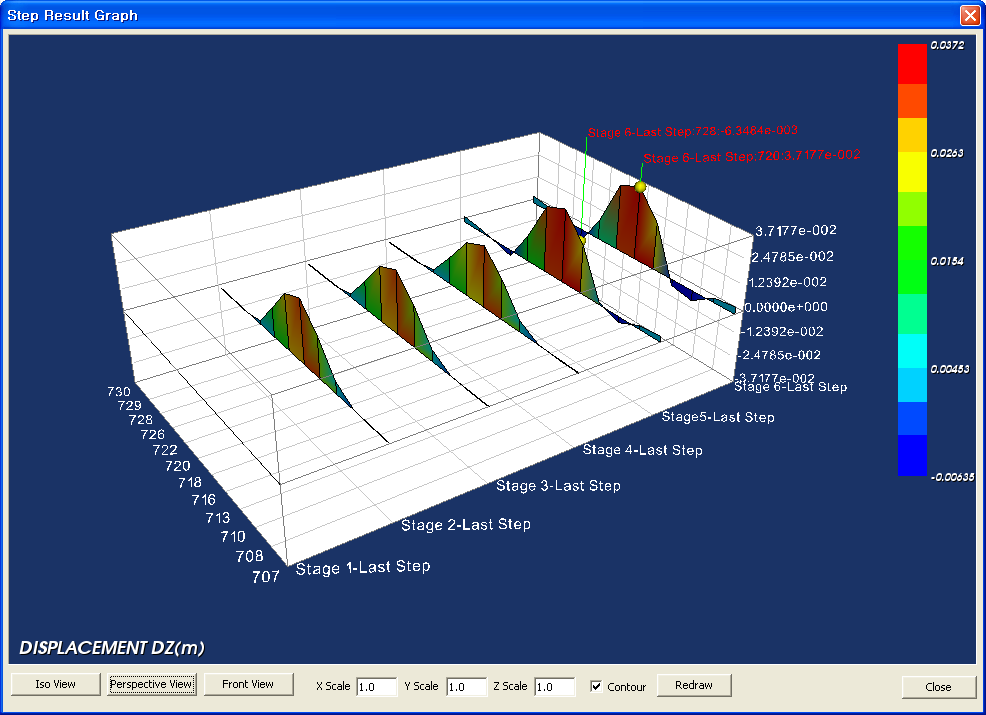 <Extract Result Graph> It projects the extracted result to a 3 dimensional graph. X-axis represents Node/Element; Y-axis represents Stage/Step; Z-Axis represents result value.