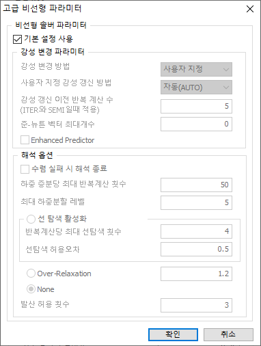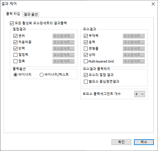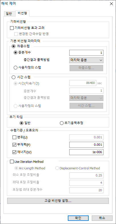 그림은 대표적인 비선형 해석에 대한 해석 제어와 결과 제어 설정창 입니다. 위와 같이