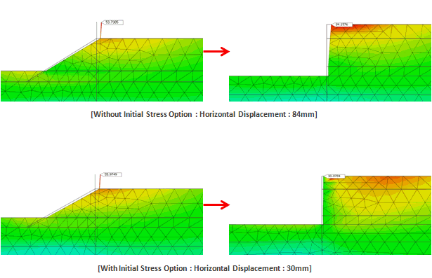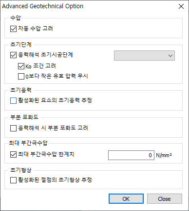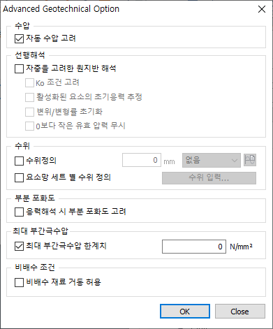 이 옵션을 해제해야 합니다. 수위선을 지정하여 응력해석을 수행하는 경우 자유절점과