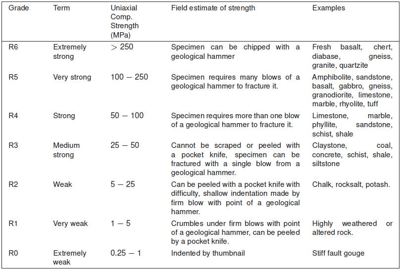 Rock)의 일축압축강도 실험 결과를 입력합니다. 암반 등급에 따른 일반적인 수치는 아래와 같습니다.