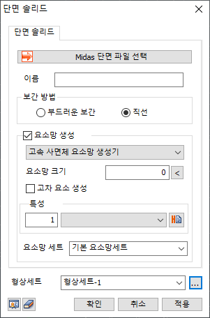 midas Civil 또는 midas Gen으로 작성한 프레임 데이터 (*.mcs) 파일을 선택합니다. 선택한 프레임 요소의 양단의 단면을 다차곡선에 따른 보완 (부드러운 보간), 선형 보간(직선)을 정의하면, 자동으로 솔리드 요소로 불러집니다.