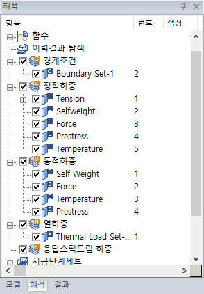 등록된 경계조건 세트는 작업 트리 > 해석 > 경계조건 하부에 자동등록되며, 체크박스를 통해 화면 상에 보이거나 감추기할 수 있습니다.